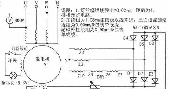 柴油發(fā)電機(jī)組實(shí)質(zhì)是臺(tái)三次諧波自勵(lì)磁凸式三相四線同步發(fā)電機(jī),因具有輸出功率大、適合移動(dòng)等優(yōu)點(diǎn),故廣泛用于廠礦、工程施工等場(chǎng)合。雖然功率不同的發(fā)電機(jī),其繞組數(shù)據(jù)有所不同,但電路連接基本相同。